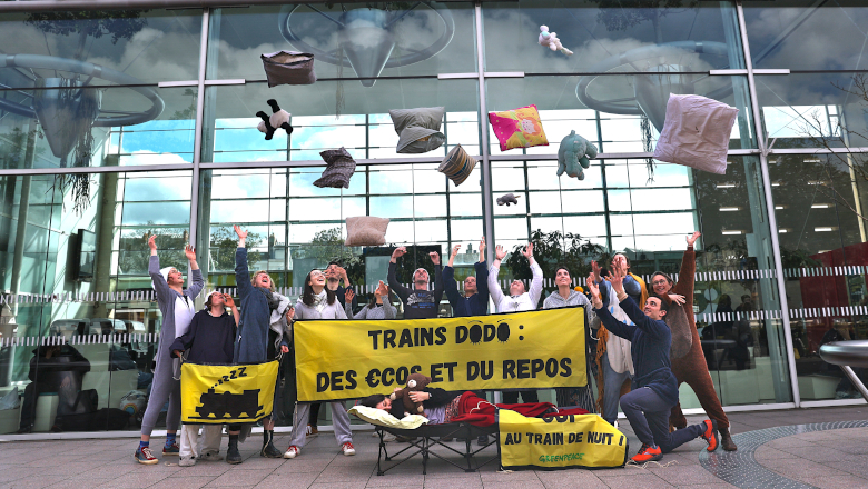 Une action « Oui au train de nuit » s’est déroulée à la gare d’Angers Saint-Laud. – © Greenpeace Angers