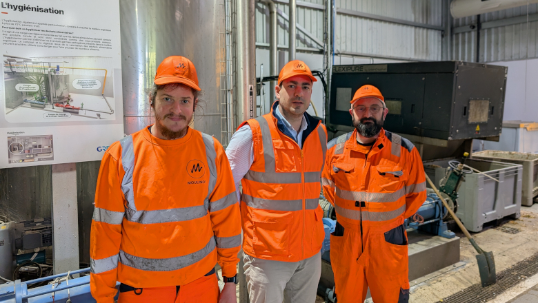 Edouard Van Heeswyck, directeur régional de Moulinot, entouré de Mathias Portier, responsable du site angevin (à gauche) et Guillaume Jarry, responsable adjoint (à droite) – © Angers.Villactu.fr