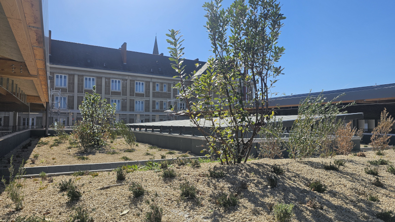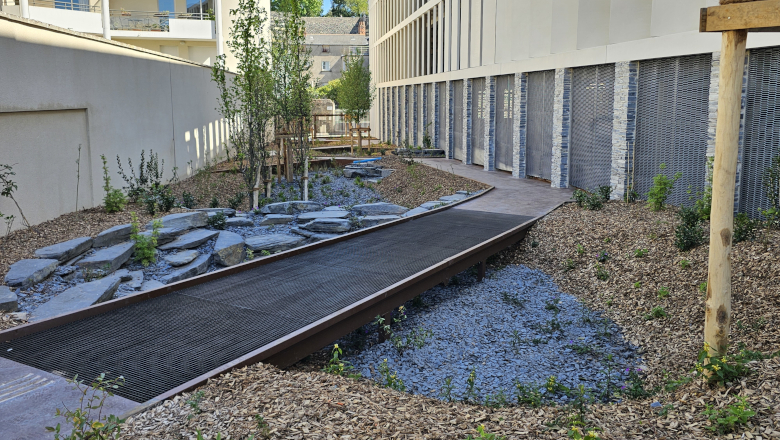Deux venelles de huit mètres ont également été aménagées de part et d’autre du bâtiment, dont une végétalisée pour assurer une continuité piétonne et favoriser l’infiltration des eaux pluviales.