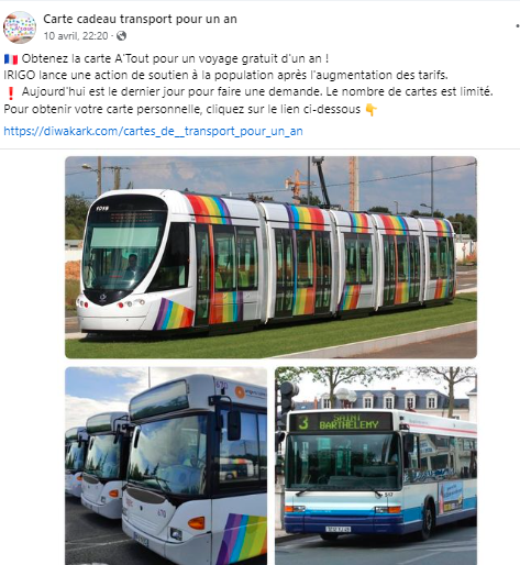 Il y a quelques jours, une page intitulée « Carte cadeau transport pour un an », avec une photo de la carte A’tout, a été créée sur le réseau social Facebook. Sur la publication, il est proposé d’obtenir une carte A’tout pour voyager gratuitement pendant un an sur le réseau Irigo. Les internautes sont ensuite invités à cliquer sur un lien.