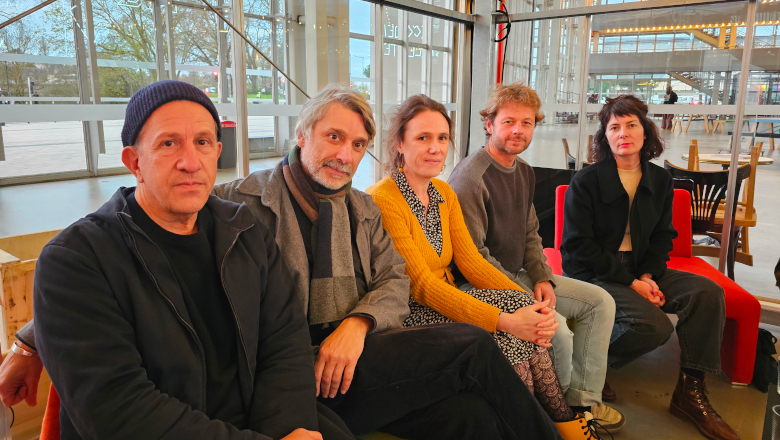 De gauche à droite : Marcial Di Fonzo Bo, Jacques Peigné (CDN Le Quai), Aurélie Fournier (Planning familial), Julien Fagault (CGT – Mission Locale), Marion Colléter (Cndc – Syndeac). – © Angers.Villactu.fr