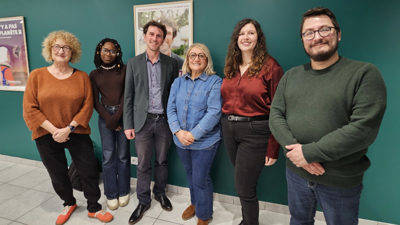 Romain Laveau (au centre), entouré de ses potentiels adjoints de quartiers. De gauche à droite : Norma Mevel-Pla, Kardiatou Ba, Nadiré Céribas, Charlotte Pelluau et Sylvain Martinet. – © Angers.Villactu.fr