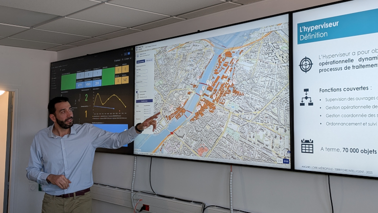 À quelques pas de la place Ney, neuf personnes travaillent dans le centre de pilotage du territoire intelligent mis en place par l’agglomération angevine. Dans ce lieu, l’ensemble des données du patrimoine connecté d’Angers Loire Métropole remonte en temps réel. Ce patrimoine connecté comprend 45 bornes escamotables, 244 horodateurs, 18 parkings, 211 carrefours à feux, 291 ouvrages liés à l’eau potable et à l’assainissement, 222 caméras de vidéosurveillance, 67 circuits d’arrosage, 53 000 points lumineux et 3 450 objets connectés à travers le territoire.