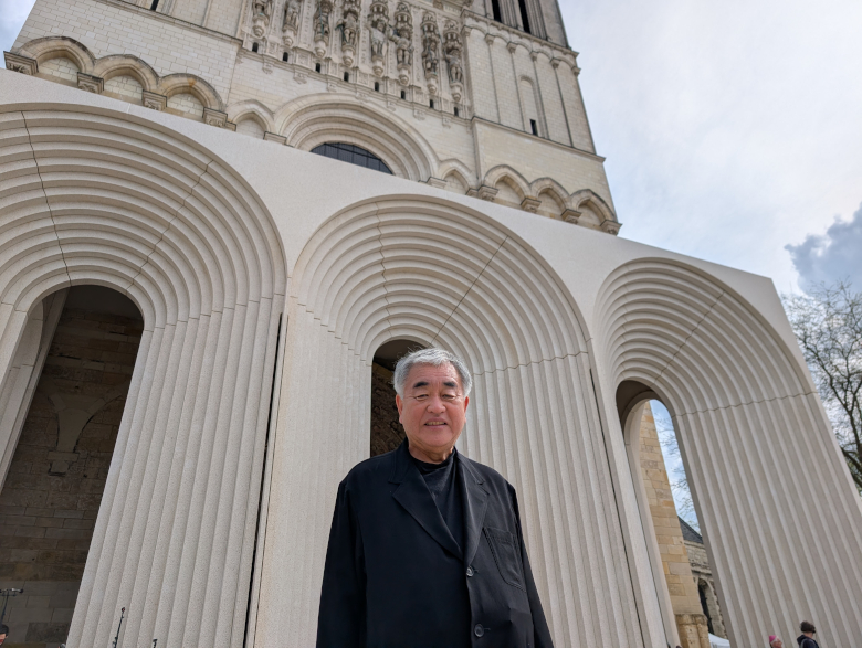 En 2020, lorsque la Direction régionale des affaires culturelles (DRAC) lançait un concours international d’architecture visant à désigner l’architecte en charge de la réalisation de la nouvelle galerie de la cathédrale d’Angers, cinq candidats avaient été retenus à l’issue de la première phase de sélection. Les architectes français Philippe Prost, Rudy Ricciotti, Bernard Desmoulin et Pierre-Louis Faloci, mais également l’architecte japonais Kengo Kuma. Cet architecte à la réputation international compte parmi ses réalisations le stade olympique de Tokyo (2020), le musée Hans Christian Andersen à Odense (2022), ou encore le musée Albert-Kahn à Boulogne-Billancourt (2022). C’est lui qui sera choisi en octobre 2020 pour réaliser cette galerie contemporaine, avec pour objectif de protéger les sculptures polychromes du XIIIe siècle du portail occidental de la cathédrale.