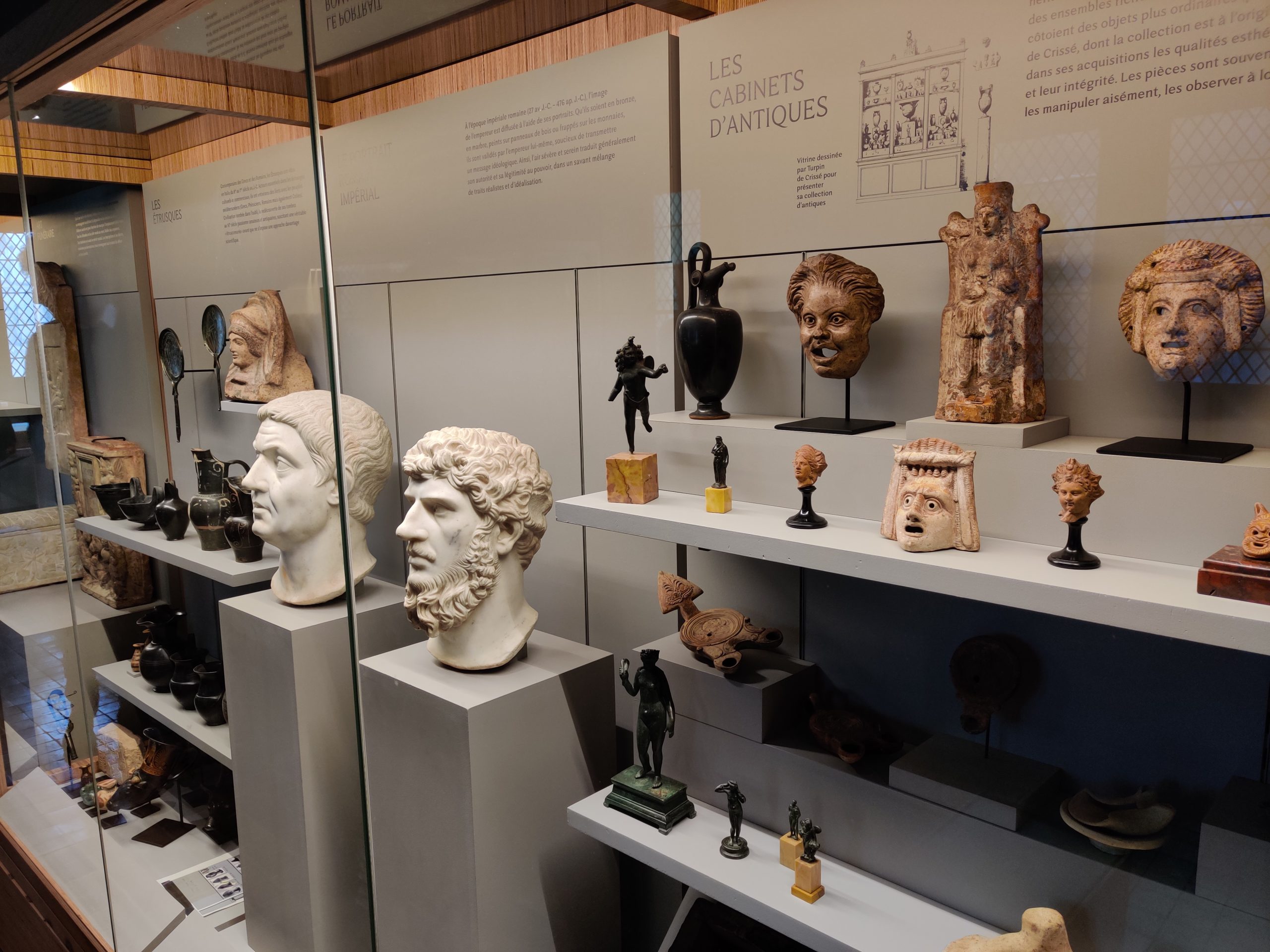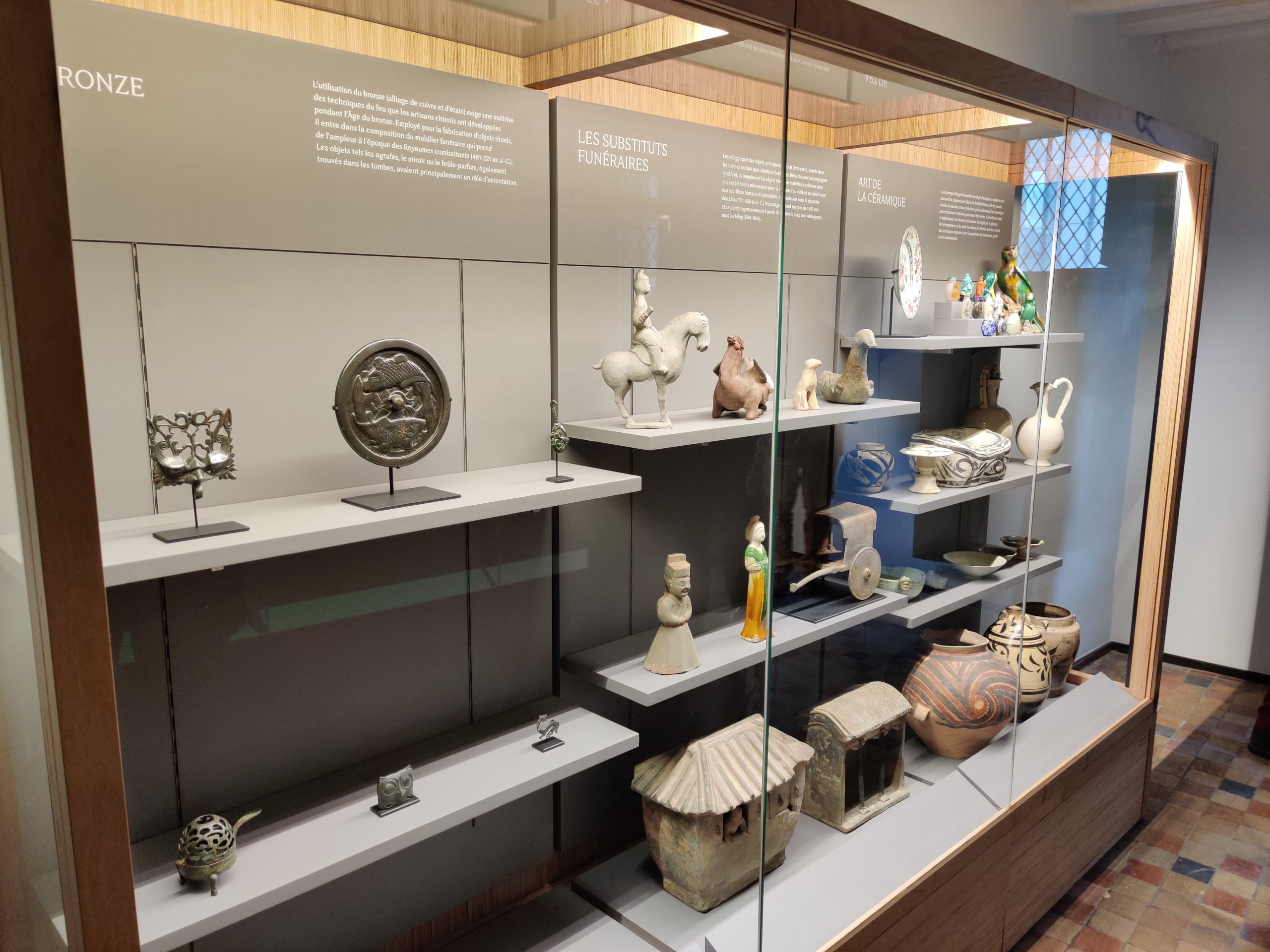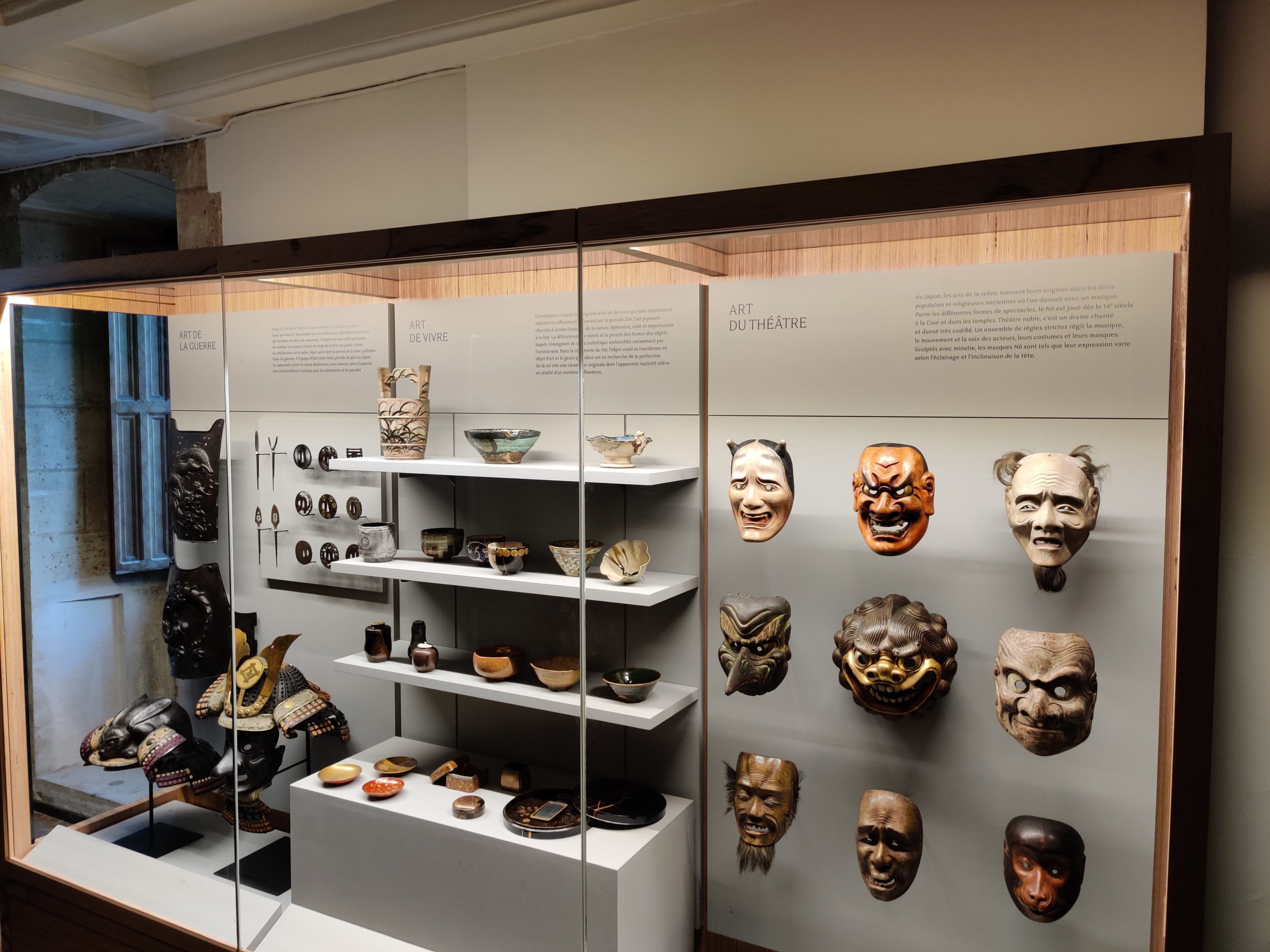 Dans les différentes vitrines se côtoient vases grecs, céramiques ainsi que des objets funéraires égyptiens dont un couvercle de sarcophage venant du muse du Louvre. Dans une autre salle, les arts chinois et japonais permettront de découvrir d’étonnants masques de théâtre japonais ou encore des céramiques et bronzes chinois.