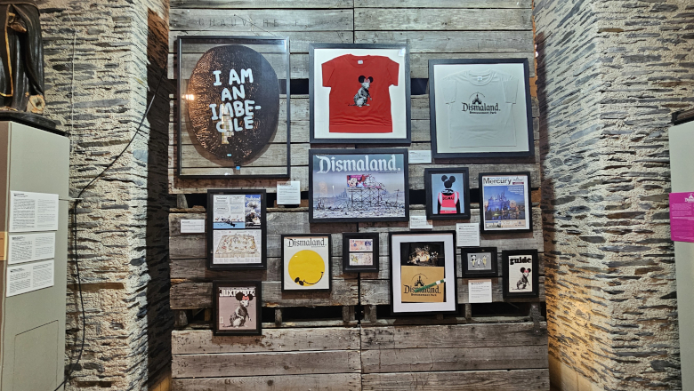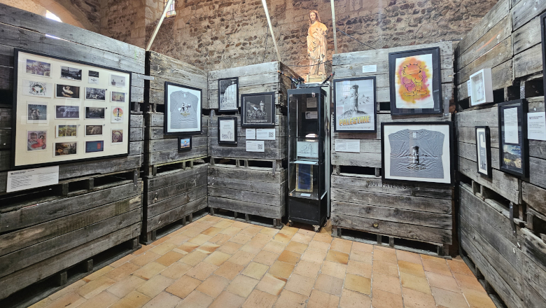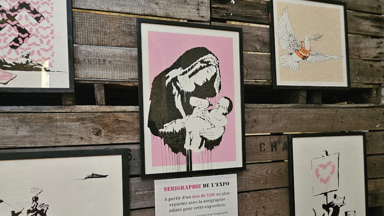 Dans la nef, près de 300 œuvres et objets sont présentés : sérigraphies, photographies d’interventions urbaines, ou encore objets dérivés. L’ensemble retrace le parcours d’un artiste anonyme devenu une figure mondiale, connu pour ses prises de position sur les inégalités, les migrations ou encore les dérives du capitalisme.