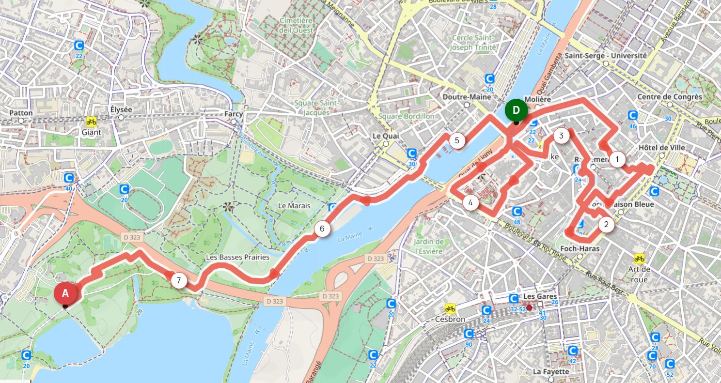 Le trail découverte de 8 kilomètres partira de l’esplanade Cœur de Maine, puis passera par la place Molière, la chapelle des Ursules, l’Hôtel de Ville, la collégiale Saint-Martin, le lycée Saint-Benoît, les jardins de la Préfecture, le Grand Théâtre d’Angers, la montée Saint-Maurice, la place Kennedy, la promenade Jean-Turc, le pont de Verdun, la cale de la Savatte, le quai Tabarly, le parc Balzac, la maison de l’environnement, avant une arrivée sur l’esplanade du parc de loisirs du lac de Maine.