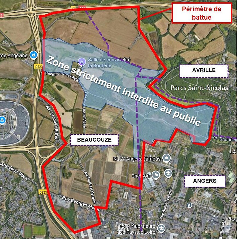 Une partie des parcs Saint-Nicolas sera interdite au public de 7 h à 16 h le jeudi 18 décembre. Ce jour-là, une battue aux sangliers, organisée par le lieutenant de louveterie habilité par la préfecture de Maine-et-Loire, aura lieu dans une zone à cheval sur les communes d’Angers, Avrillé et Beaucouzé.