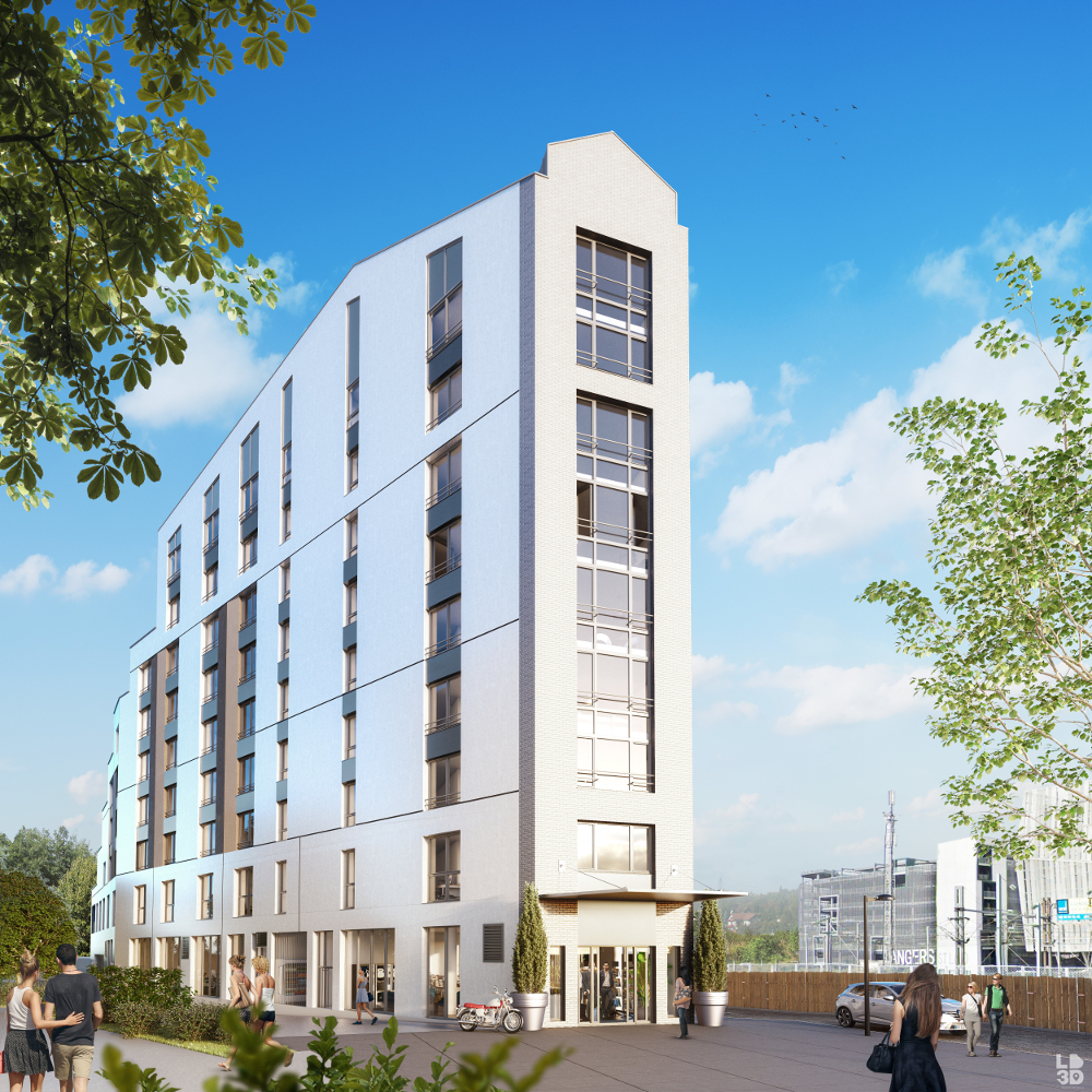 Dessinée par l’architecte angevin Frédéric Rolland, cette résidence 4 étoiles de 8 étages fera face au siège de la Soclova. Elle disposera de 123 chambres, dont 10 suites de 29 m² et 10 suites de 35 m². Un niveau de sous-sol proposera 16 places de stationnement pour les clients. Ces derniers auront accès à un espace de coworking et à un patio végétalisé. Enfin, la résidence accueillera une brasserie sur 500 m² avec un accès indépendant depuis la place Giffard Langevin.